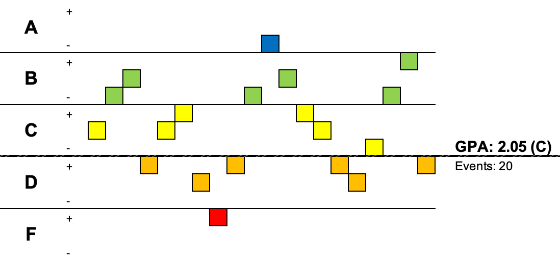 We all have our good days and our bad days. So imagine that we give Biden a letter grade for each IPA, from A+ to F-. Suppose that there’s a pretty wide range, but on average Biden winds up in the C's. You could draw a plot of these that looks like this: