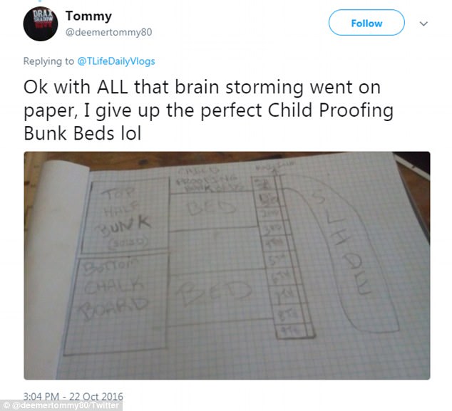 The man tweeted about childrearing and once shared a drawing he had completed of 'child proofing bunk beds'